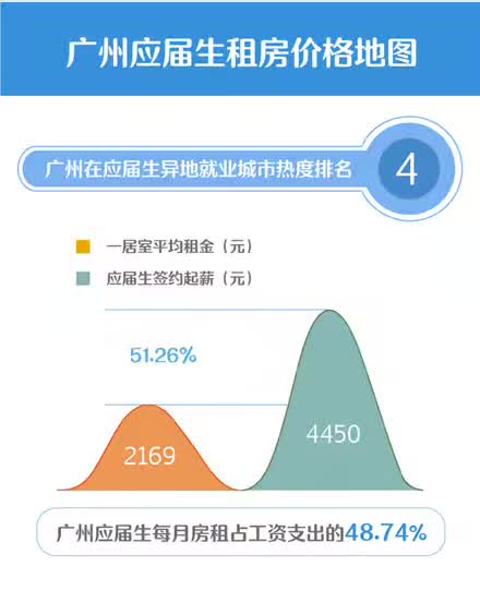 在广州2017年应届生租房开支占到月均工资收入48.7%。广州市7月份一居室整租均价达到2169元,在一线城市中最便宜,天河区领衔全市达到5232元,海珠区紧随其后达到2694元。