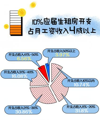 本次报告显示,84.2%的应届生毕业生需要租房,近6成每月租房开支占到月工资收入20%以上,其中超过10%应届生租房开支占到月工资收入40%以上。
