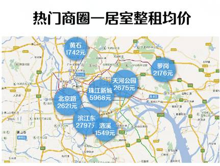 同一商圈周边小区价格也存在明显差距,以珠江新城中商圈为例,保利心语花园一居室整租6093元,而距此直线距离不足1公里的中海璟晖华庭仅为2551元。
