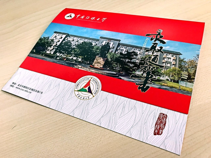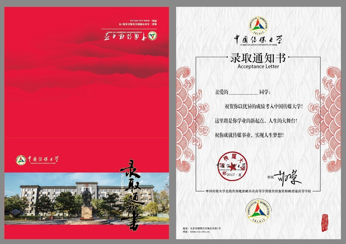 中国传媒大学亮眼的红色,是中国传媒大学2017年的喜报。正面是美丽的传媒大学立德楼,立德楼前伫立着至圣孔子的雕像。《录取通知书》五个书法字,采用了描金和起鼓工艺,以示庄严和隆重。