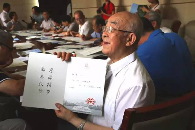 在参与今年书写毛笔通知书的老师中,文占申教授年龄最长,他以85岁高龄,仍坚守在书写的书案前。