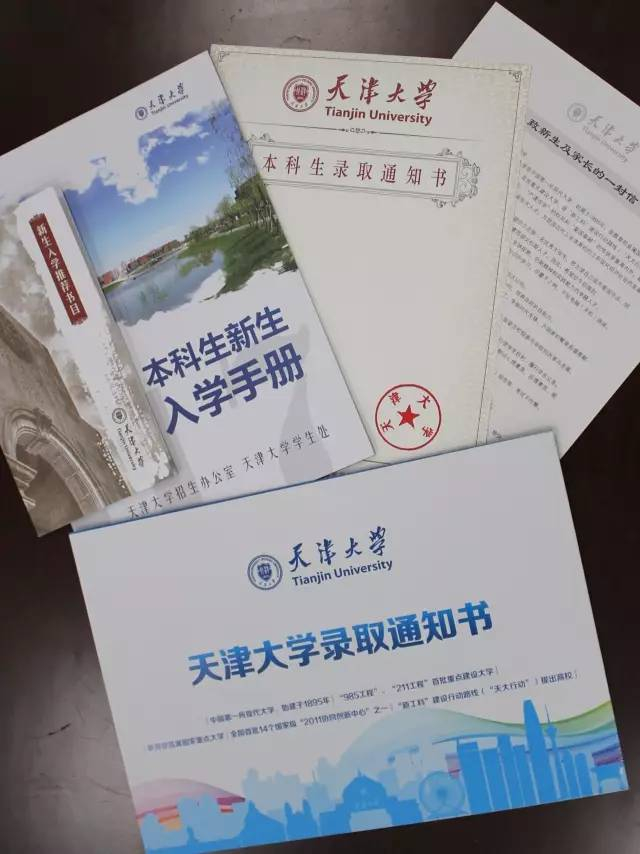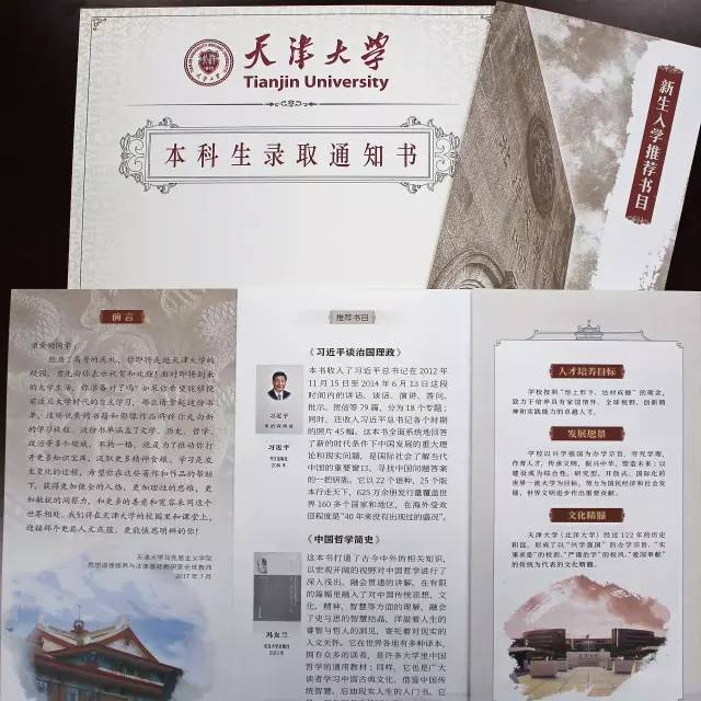 随录取通知书一同寄出的还有一份来自天津大学精心准备 “新生入学推荐书目”,该书目包括《习近平谈治国理政》、《中国哲学简史》、《平凡的世界》、《苦难辉煌》、《中国震撼三部曲》、《如何阅读一本书》六本书籍和《大国工匠》、《国家相册》、《航拍中国》三部影像作品,涵盖了文学、历史、哲学、政治等多个领域,希望同学们在这些著作和作品的帮助下,获得更加健全的人格,更加理性的思维,更加敏锐的洞察力,以更多的善意和宽容开启崭新的大学生活。