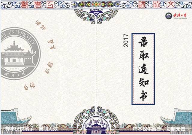 武汉大学武汉大学2017级研究生录取通知书由武汉大学城市设计学院苏程同学设计。