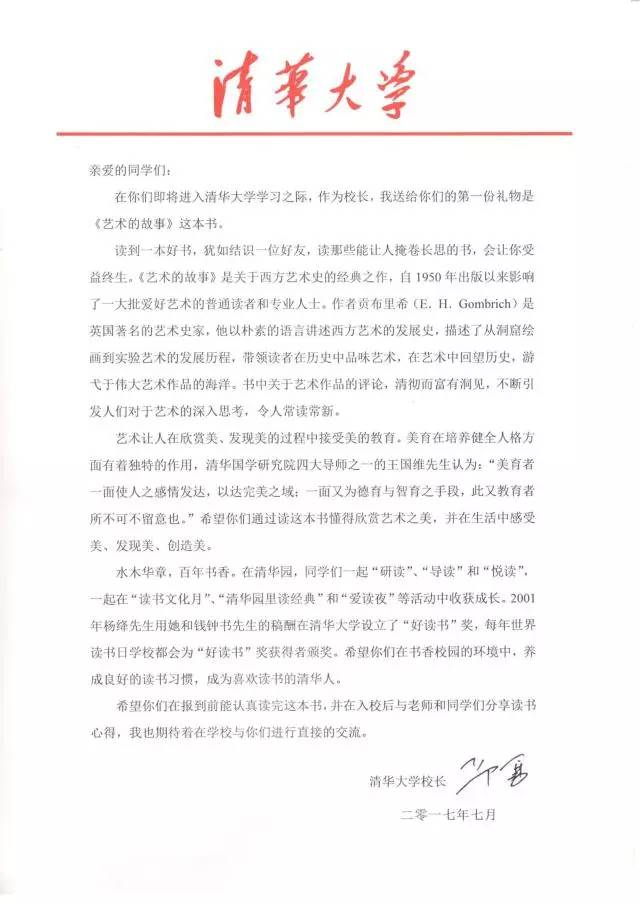 清华大学清华大学发出的录取通知书,除了入学材料,还会寄去一本书,这已成为清华大学的传统。去年和前年,清华大学分别选择了《瓦尔登湖》和《平凡的世界》,今年寄出的则是《艺术的故事》。