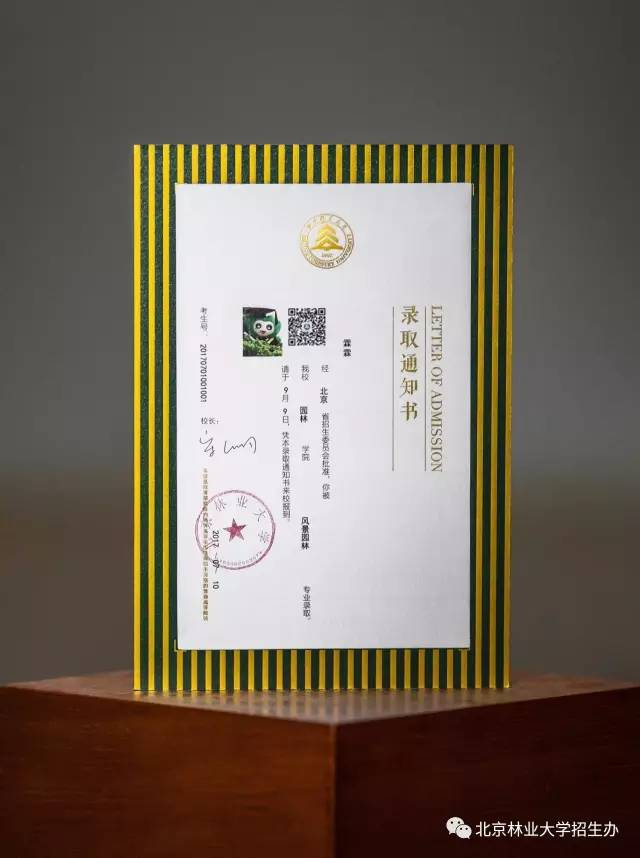 录取通知书的主图案是从校徽中提取的三角形元素来表现山、水、木、人的抽象图形,山之坚毅、水之柔韧、木之繁茂、人之活力,这是北林的精神,是每一名新绿即将浸染的绿色印记。而且四个图案是随机的: