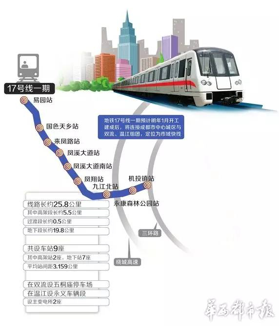 成都轨道交通17号线为贯穿中心城,连接西南—东北方向的快线,途径双流、中心城、青白江。线路全长81.48km,设车站29座,平均站间距2.91km。