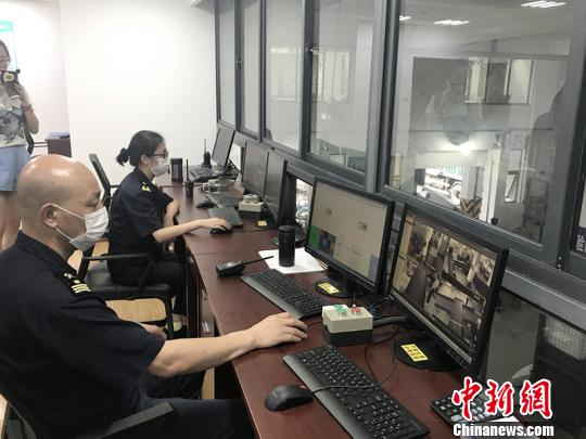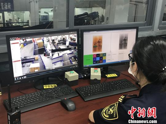 身穿制服的海关工作人员通过电脑,仔细浏览着每个邮包的X光检验结果。 杨颜慈 摄