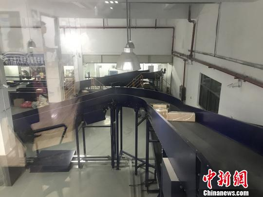 在高速运转的检验流水线上,一个个国际邮包整齐地“列队”照X光,并通过传送带分拣到不同区域。 杨颜慈 摄