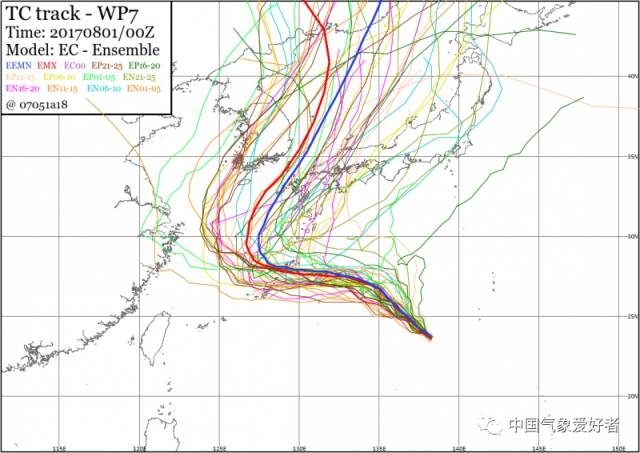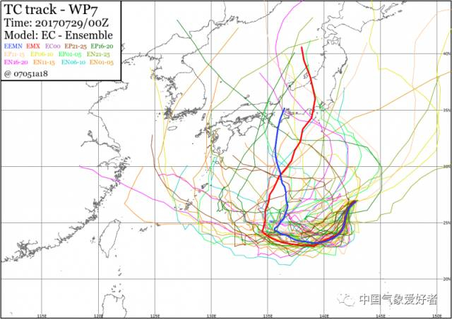 7月28日、8月1日欧洲数值集合分析路径,可见路径大为西调。台风论坛07051a18制作