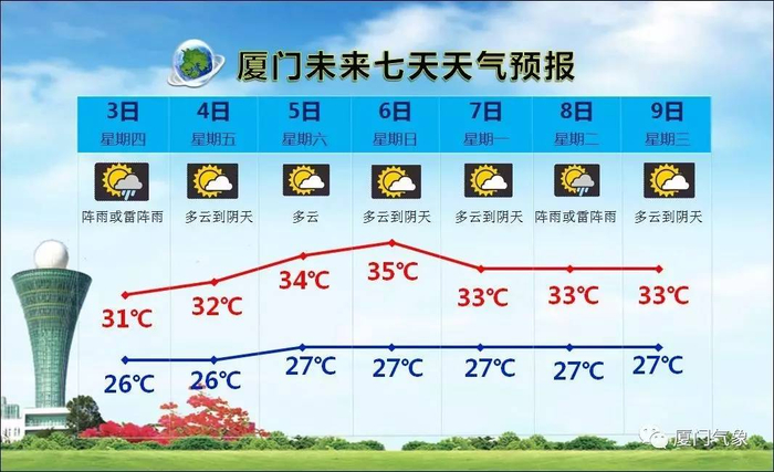 据厦门气象台:明天开始,厦门气温将逐日回升,大后天的最高气温上升到34℃,然后是35℃!岛外地区甚至37℃!