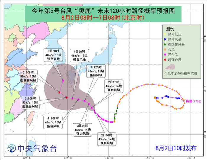 福建省气象台预测:8月6—7日,5号台风“奥鹿”在东经135附近并西风槽内,副高减弱,全省天气阴到多云,有阵雨或雷阵雨,西部的部分有中雨。8月8-9日,西风槽及低层切变南压,全省有阵雨或雷阵雨,中北部部分有中雨,北部局部大雨到暴雨。