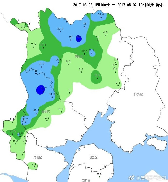甚至昨天午后15点,岛外自西南向北,陆续出现了短时强对流天气,尤其是集美的西北部和同安的北部山区雨量较大,雨量超过50毫米。