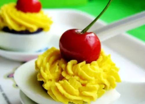 7.蛋黄泥用裱花袋在紫薯上挤出花,然后放上一颗樱桃点缀