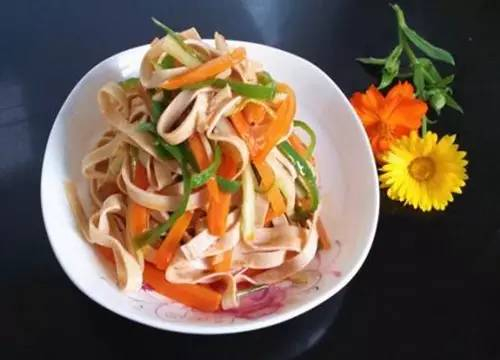 2.水开了放豆皮丝,黄瓜,胡萝卜丝,烫熟即可