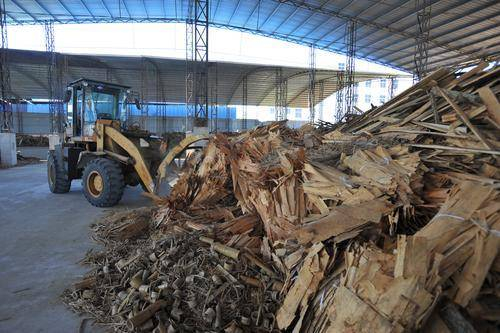 竹木废料、枯枝树皮被送到装饰建材生产企业,准备加工。
