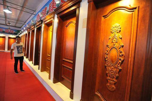 用竹木废料、枯枝树皮制成的板材加工制成的木质套装门。