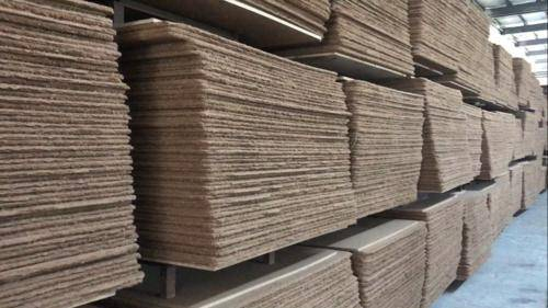 用竹木废料、枯枝树皮制成的板材堆放整齐,等待进一步加工。