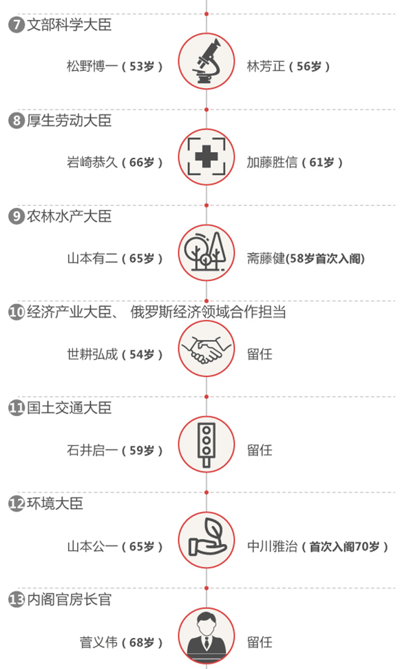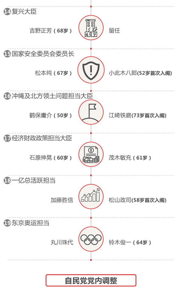 因此,被民众评价为“不信任”的安倍在这次内阁改组中不敢掉以轻心。日本经济新闻3日报道,本次内阁重组在维持了以副总理兼财务相麻生太郎、官房长官菅义伟为主框架的同时,还重新配置了13名经验丰富的人。通过任用这些有过内阁成员经验或熟悉各领域的人,安倍希望表明旨在组建一个务实的内阁,希望通过展现全新面貌来扭转颓势。在官僚问题层出不穷,“安倍独大”的指责中,支持率逐渐下降的安倍政权表现出了“守”的态势,但也为了一些亮点颇费苦心。