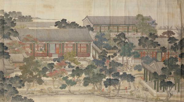 清张廷彦绘《乾隆行乐图》中描绘乾隆皇帝在九州清晏怡情书史北侧池上居鱼池前的场景