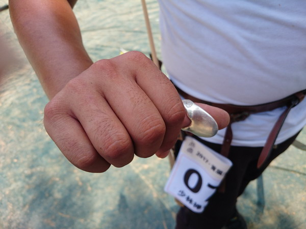 参赛者展示自己传统弓使用的扳指。澎湃新闻记者 蒲垚磊 图