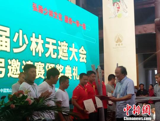 图为在少林禅弓邀请赛颁奖典礼上,中国射箭协会传统弓分会名誉主席徐开才为获奖参赛者颁奖。 岳龙 摄