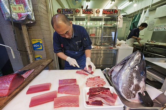 资料图:筑地市场鱼贩在切生鱼片 图片来源:东方IC据报道,着火点为一座三层楼房,起火时间为东京时间下午3点多(北京时间下午2点多)。4点50分左右,东京消防部门接到火警电话,并出动40多辆消防车。路透社报道说,因为街道狭窄,房屋布局紧密,火势难以控制。