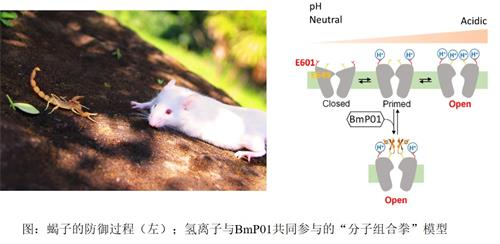 为揭示蝎子捕食和防御分子策略,近日,昆明动物所研究员赖仞、副研究员杨仕隆与加州大学戴维斯分校教授郑劼领导的研究团队开展合作研究,揭示了蝎子蜇伤产生剧烈疼痛这一现象背后的分子机制。蝎毒中存在一种由29个氨基酸组成的名为BmP01的神经毒素多肽,BmP01能够激活辣椒素受体TRPV1,并如同品尝红辣椒一般产生快速并且剧烈的痛觉反应。有趣的是,与辣椒素不同,BmP01激活TRPV1受体还依赖蝎毒中存在的氢离子。与大多数产毒动物毒液一样,蝎毒是一种pH6.5左右的弱酸性物质,这种弱酸性存在生物学价值吗?研究发现,在蝎毒的弱酸环境下,BmP01激活TRPV1的效率比在中性环境下要强两到三个数量级,从而诱导剧烈疼痛。反之,如果蝎毒不具有这种弱酸性环境,则无法高效激活TRPV1并产生疼痛。因此,在蝎子蜇伤产生剧烈疼痛的过程中,存在着这种以氢离子为材料的极为低廉但却十分高效的“分子组合拳”机制。