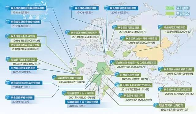 中国军队参加联合国维和行动示意图(统计截至2017年5月,数据来源:国防部维和事务办公室)