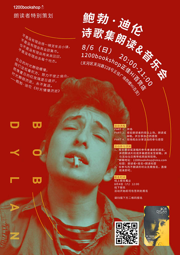 2004年世界巡演上,鲍勃·迪伦的演出经纪人这样进行了开场白:他是1960年代对抗文化的誓约之声;他驱使民谣与摇滚乐同床共寝;他在1970年代涂上了浓妆,然后消失在滥用药物的阴影中;当他再次出现时开始追随耶稣;再后来他突然改弦易辙,在1990年代末发行了他音乐旅程中最强有力的音乐。8月6日晚,我们将在1200bookshop正佳Hi百货店举办鲍勃·迪伦的朗读&音乐会。如果你不熟悉鲍勃·迪伦,那么,记住一件事就够了:他是个诗人,歌词与旋律是同等重要的组成部分。不管是朗读还是演唱,你都能从中重新发现音乐和诗紧密的关系。