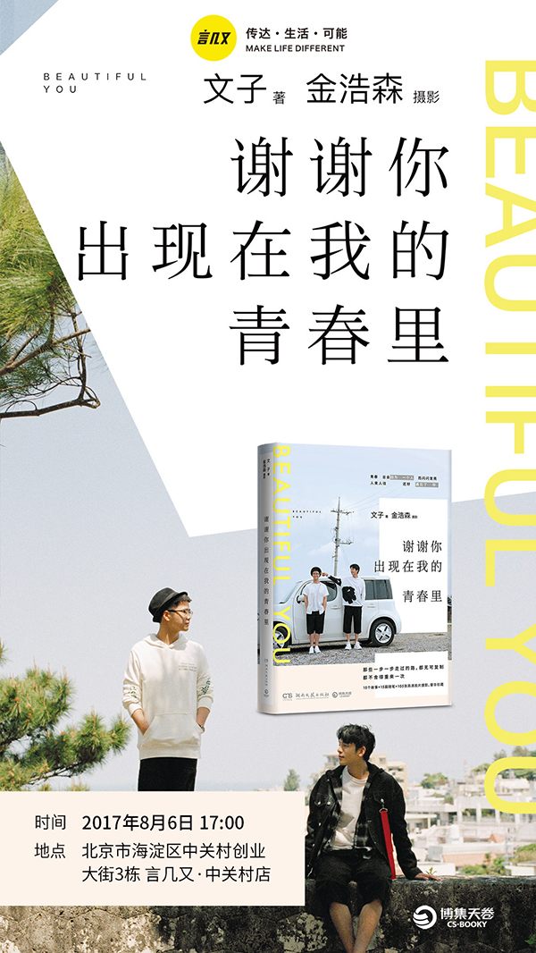 从今年6月开始,文子、金浩森开始了《谢谢你出现在我的青春里》巡回签售,目前已经走过十余座城市签售,遇见上万张面孔。8月6日,两人将携书亮相言几又中关村店,向大家分享他们关于青春、成长的种种感悟。