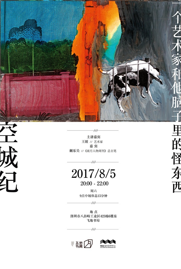 在王顷早期一本影集的文本中,他写道:“有一段时间我总梦到同一条坎坷低矮的街道,似乎是外国又似乎是北京,景致却分明是商丘和开封。”故乡成为想象的故乡,王顷的“空城”又承载了一种“此在”与“异地”的暧昧感,他将世界描述成一本书,这里也是他所构建的情景剧场,王顷像一位严肃又开明的探案人,细心辨认世界的字句和图案。8月5日,两位艺术家做客飞地书局,与大家分享他们脑子里的怪东西。