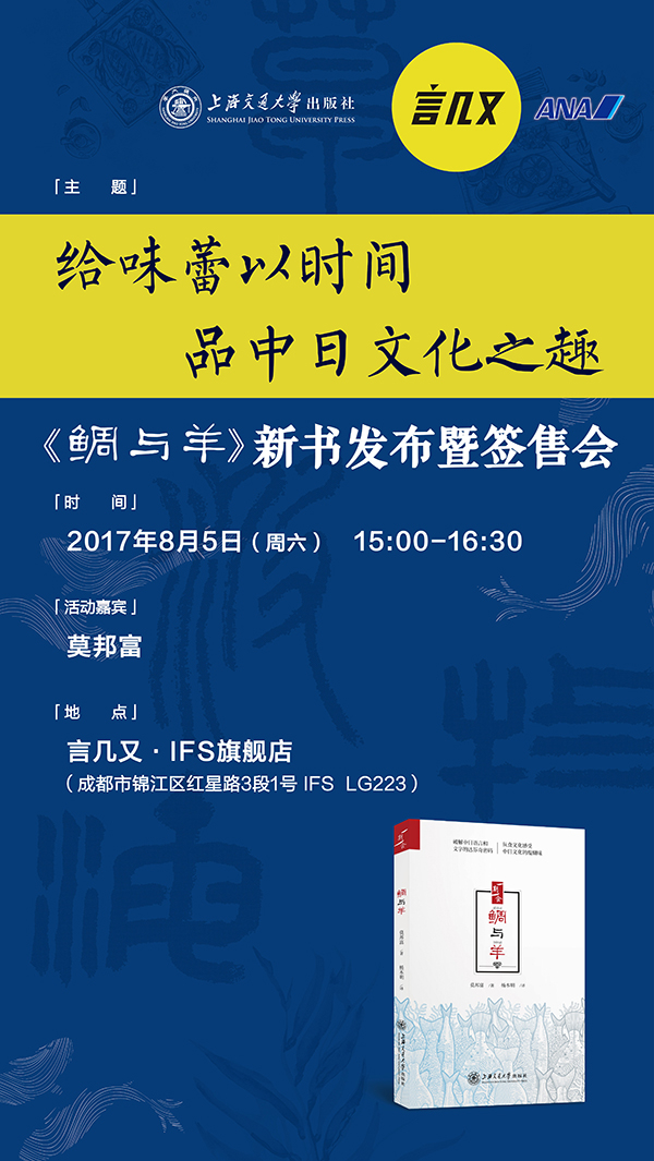 《鲷与羊》是著名旅日华人作家莫邦富先生的倾情之作,由“吃”及“文”,从餐桌上追溯两国语言文字的源流,堪称“舌尖上的中日文化宝典”!本书从饮食文化的角度切入,趣谈中日文化的差异。8月5日,莫邦富先生将从源流回归生活日常的文化百态,从而展现中日文化碰撞中的妙趣。