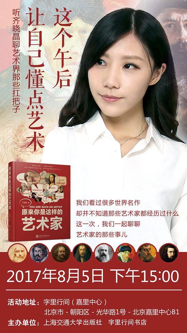 达·芬奇,收到定金却不给甲方画画;梵高,明明去杀人,为什么最后却自杀了;莫奈,说好专一的,却娶了经纪人的妻子;伦勃朗,画了幅名作,却再也没人找他买画了;高更,一幅逼婚画,却卖了十个亿。我猜你一定看过很多世界名画,却不一定知道那些艺术家们都经历过什么。8月5日,《原来你是这样的艺术家》作者齐晓晶与读者相约,她不是教你看懂一幅画,而是让你认清一个人,了解艺术家的真实生活,再欣赏他们的作品,你也许会有新的感悟。