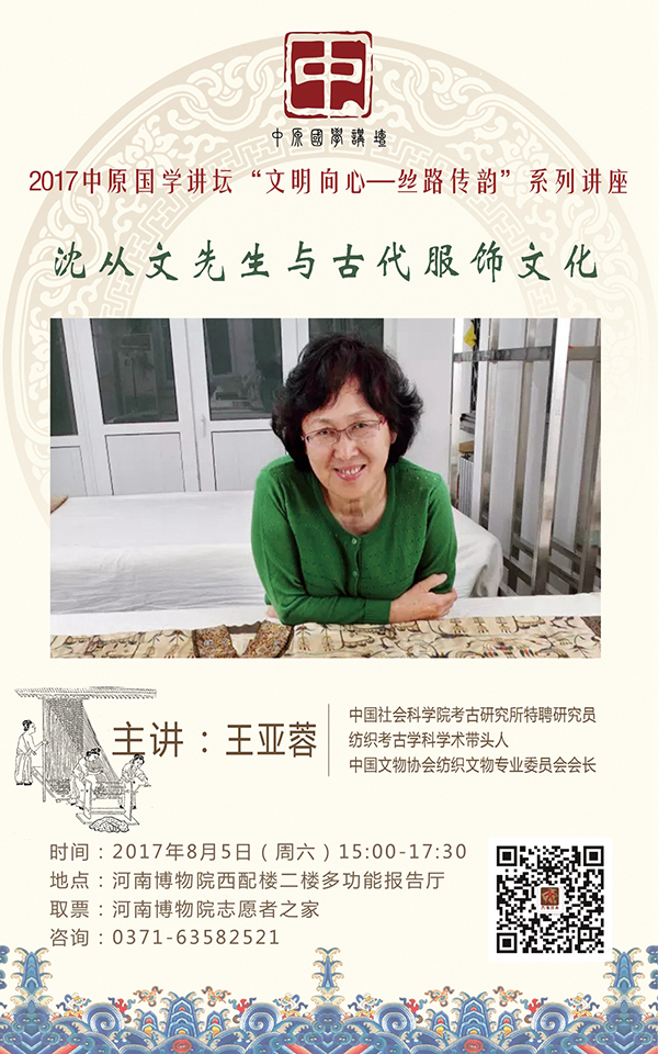中国素有“衣冠王国”之美称,服饰历史源远流长。然而,“纸寿千年,绢寿八百”,当这些盛装华服在深墓中沉睡数千年后出土,早已是“鹑衣百结隐春秋”,失去了它们原本璀璨绚美的模样。以沈从文先生、王㐨先生、王亚蓉先生为代表的第一代纺织考古工作者,在当时究竟是怎样的工作概况?纺织考古对于当代的服饰文化研究又有着怎样的重要意义?8月5日下午,2017中原国学讲坛“文明向心-丝路传韵”系列讲座将特邀中国社会科学院考古研究所特聘研究员、纺织考古学科学术带头人、中国文物协会纺织文物专业委员会会长王亚蓉做客河南博物院,为大家带来一场题为《沈从文先生与古代服饰文化》的精彩讲座。