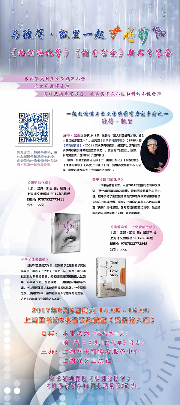 彼得·凯里被誉为”澳大利亚最有才华、最令人激动的作家之一“,他曾两获布克奖,其作品充满奇思妙想,兼具寓言式小说和科幻小说特征。最近,上海译文出版社推出了他的两部作品:《眼泪的化学》和《偷香窃爱》,本周六下午,让我们跟随《眼泪的化学》的译者顾真和著名书评人本来老六一起,走进彼得·凯里的文学世界。