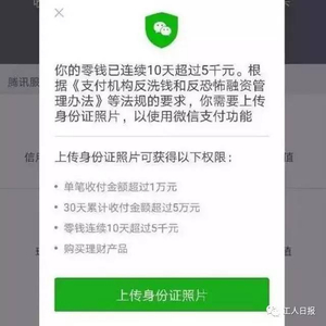 日前,不少网友收到一条提示,称微信零钱连续10天超过5000元,需要上传身份证照片后,才可以使用微信支付功能。对此,微信方面表示,是根据央行发布的《支付机构反洗钱和反恐怖融资管理办法》而推行的规定。