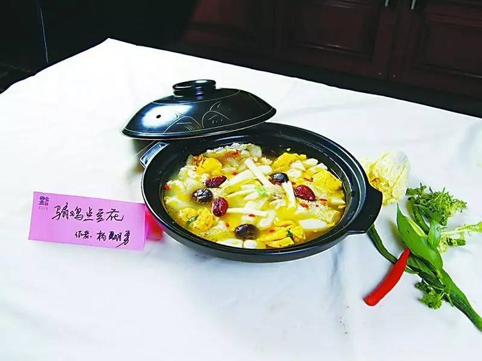 把当地的特色火腿和跑山鸡与荞饼相结合,体现了面食与菜品的创新特点,更好的运用当地特色食材,突出火腿、跑山鸡、荞饼原始口感,融合了原生态与创新,健康,绿色等元素,体现了特色菜的味美价廉的优势。