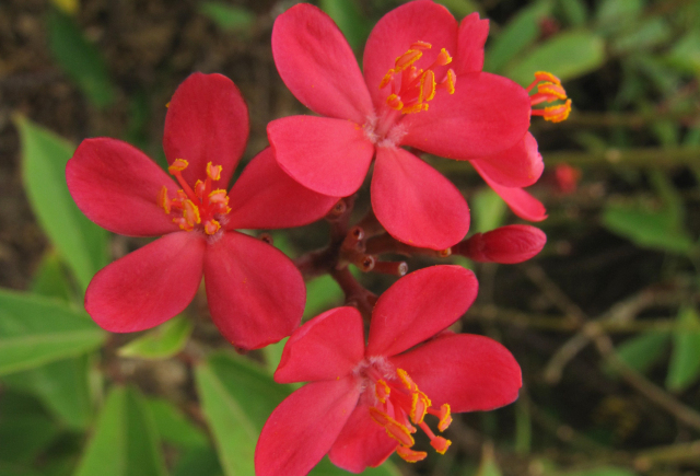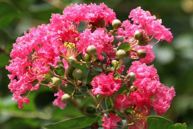 聚伞花序顶生,绣球状;花高脚蝶形,4裂;常见花色有:大红色、洋红色、黄色、粉红色、桃红色等。