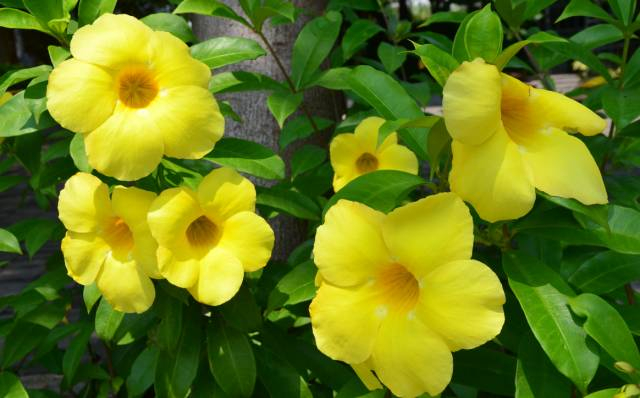 蔓性灌木,分枝柔软下垂,叶3-4枚轮生或2片对生,聚伞花序生于枝顶或叶腋,花冠黄色,漏斗状。本种花大色艳,花期长,盛花期花多而密,是美化庭园和绿地常用的木本花卉。(深圳还可见另一开花种:黄蝉)