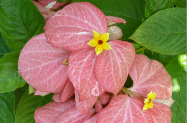 常绿灌木,伞房状聚伞花序顶生,花萼的5枚裂片均扩大呈粉红色花瓣状,花冠金黄色,檐部呈星形。