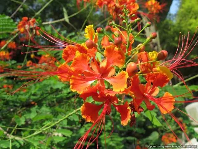 落叶灌木,伞房式总状花序顶生,花冠橙红色,边缘金色,皱波状,花丝红色,伸出花冠之外。荚果扁平。开花期间缤纷艳丽,花瓣似蝶翼,花丝似蝶须,远看宛如一群群彩蝶在绿叶中飞舞。