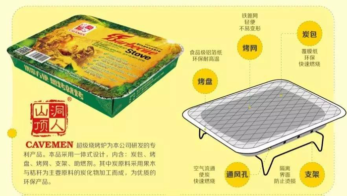 一次性烧烤炉内含炭包,利用铝箔盘作为底盘承载炭包,铝盘上方放上烤肉,整个烤盘下方用铁支架支撑,这种一体式设计让烧烤成为一种时尚。