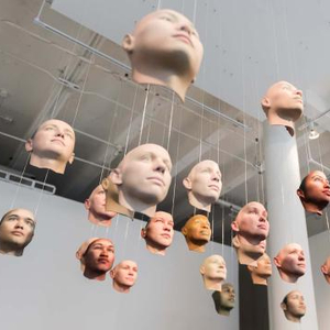 在纽约弗里德曼美术馆中的房间中心有着许多面孔–白色,黑色和棕色,他们都被用电线挂在天花板上,彼此之间有着不可察觉的相似之处。