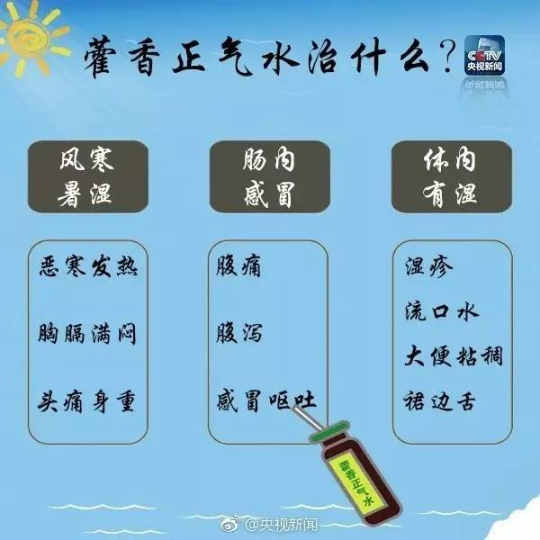 对此,南方医科大学第三附属医院药剂科主任陈文瑛做了解释。藿香正气水含有40%~50%的酒精,无论从中医还是西医角度分析,藿香正气水都不适用于中暑。对于感冒、腹泻,也不是所有情况都适用。而老人、孕妇、儿童也不适合喝藿香正气水。