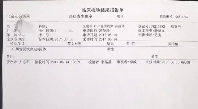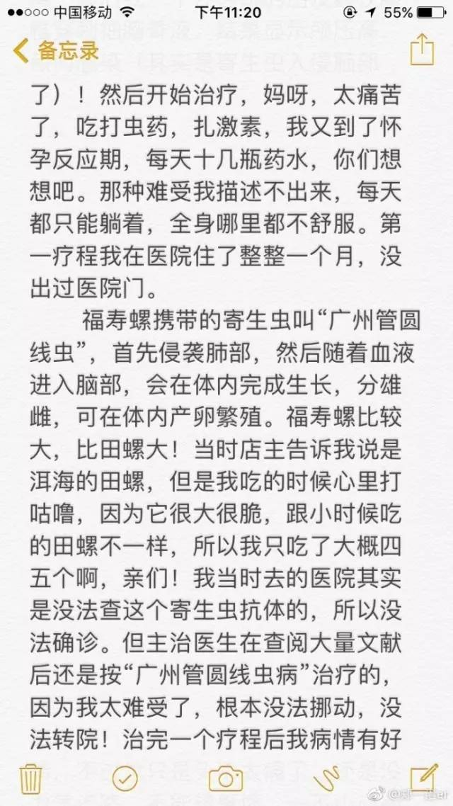 检验报告显示,她感染的是广州管圆线虫(福寿螺携带的寄生虫)。于是开始吃打虫药、打激素,之后为了治疗,忍痛做了人流。