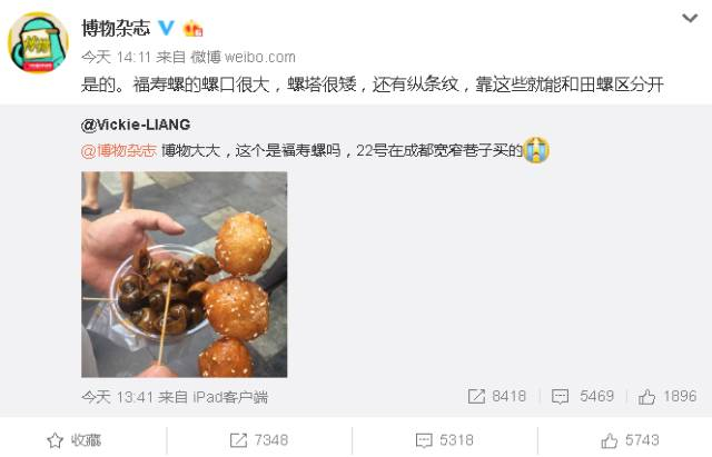 近日,微博网友@Vickie-LIANG 在成都宽窄巷子买了“爆炒田螺”,可吃着吃着却发现味道不对,口感差,后来还觉得身体不舒服。于是发照询问称,“这个是福寿螺吗,(7月)22号在成都宽窄巷子买的。”
