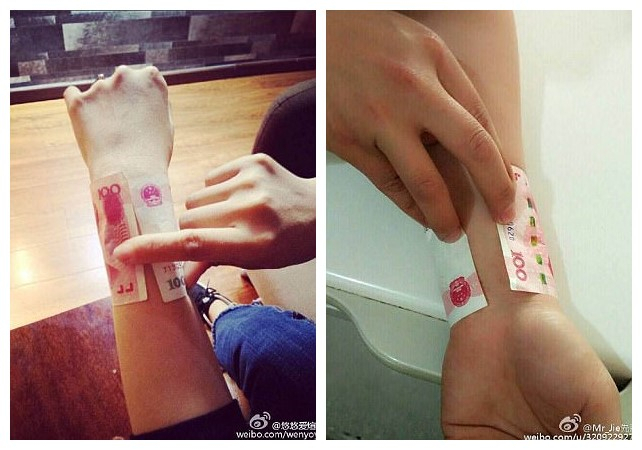 图为网友们纷纷挑战百元人民币围住手腕。