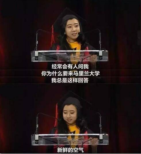 前段时间,一位来自中国的女留学生杨舒平在美国马里兰大学2017届学生毕业典礼上的一段演讲视频在网上引发热议。作为学生代表,她说:“当时在国内每天出门都要戴口罩,来了美国才呼吸到又甜又新鲜的空气。”这段演讲经过网络传播后,在网络上引起热议。