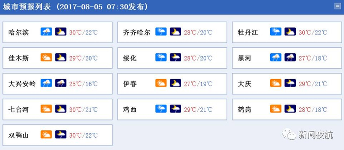 5日白天最高气温:齐齐哈尔南部、绥化、大庆、哈尔滨、牡丹江(28-30)℃,其他地区(26-28)℃。