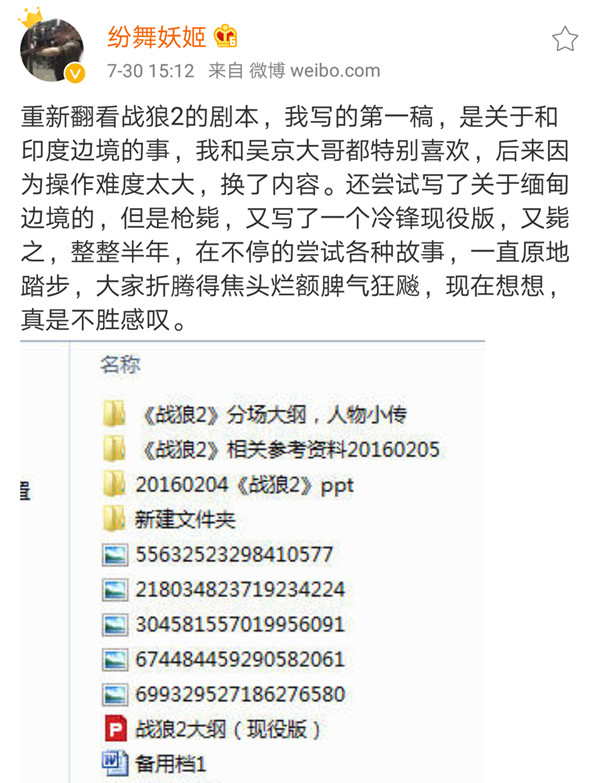 董群在其微博@纷舞妖姬 谈《战狼2》剧本。